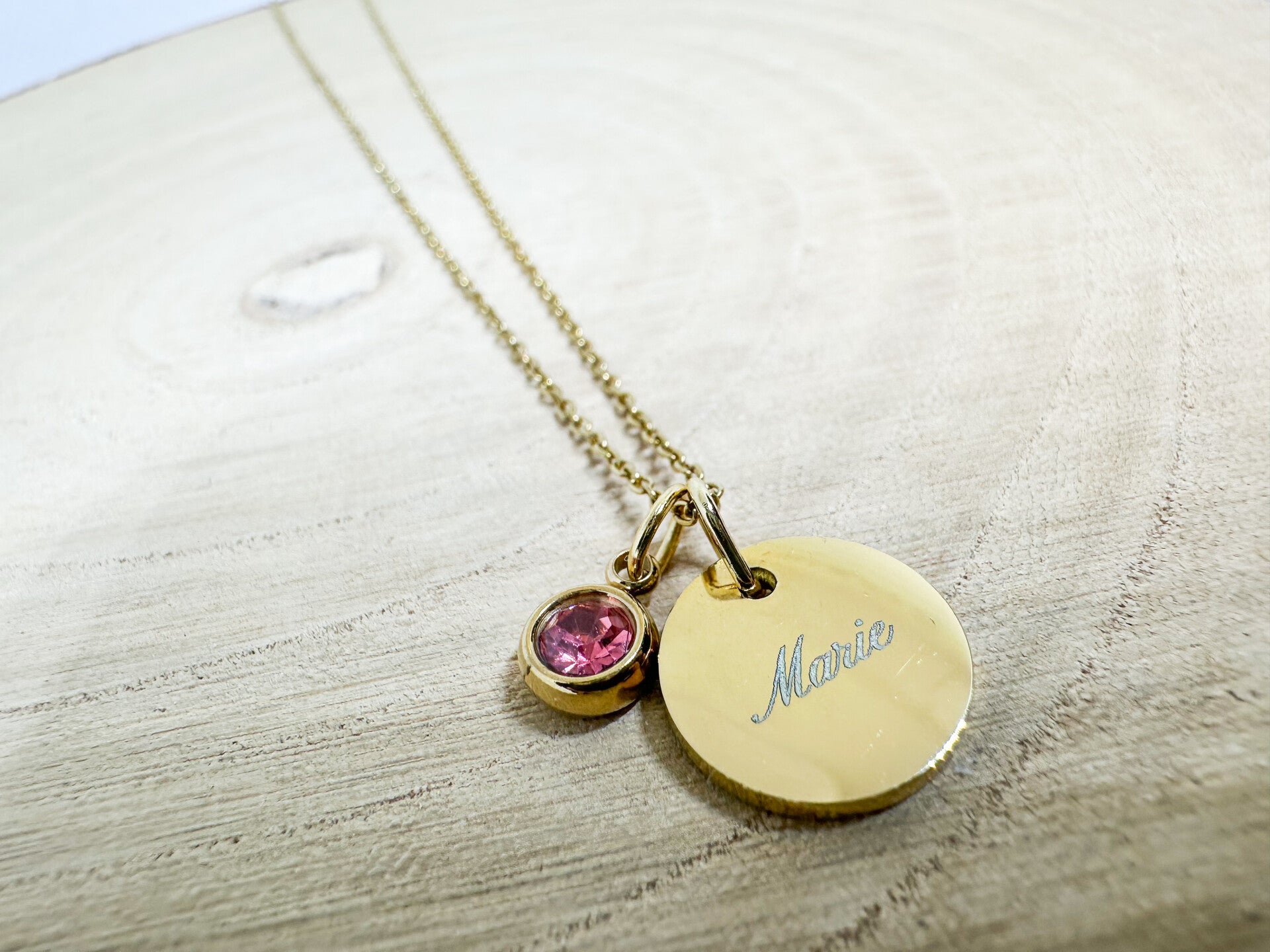 Personalisierte Halskette Gold | Silber mit Gravuranhänger mit Geburtsstein Kristall - Edelstahl